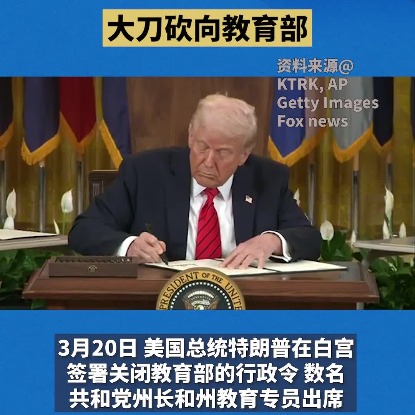 3月20日,美国总统特朗普在白宫签署关闭教育部的行政令,数名共和党州长和州教育专员出席。他指示现任教育部长琳达·麦克马洪采取“一切必要措施”推动关闭教育部,并将教育权力归还地方各州。