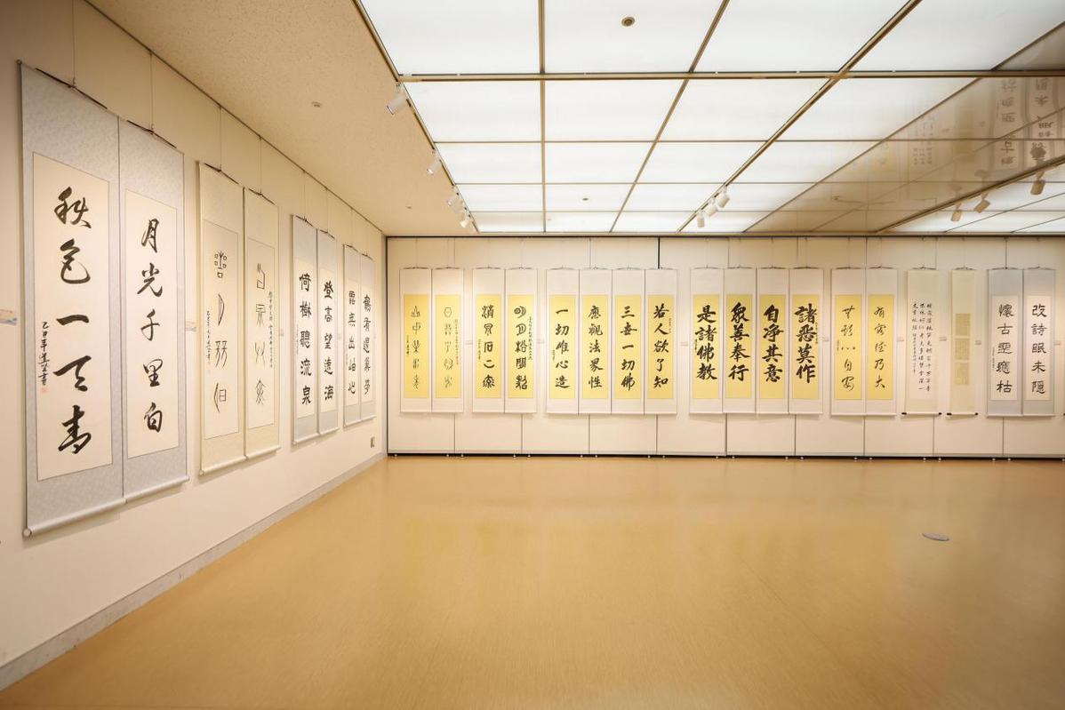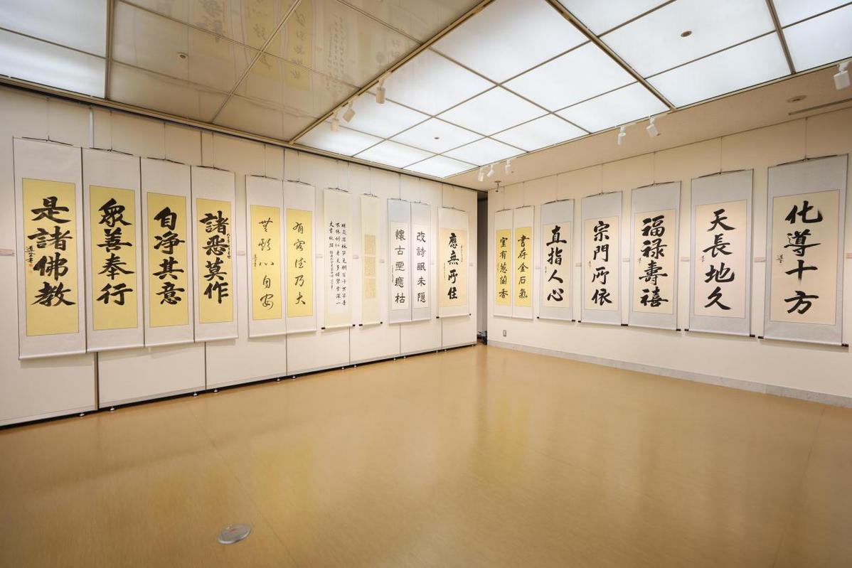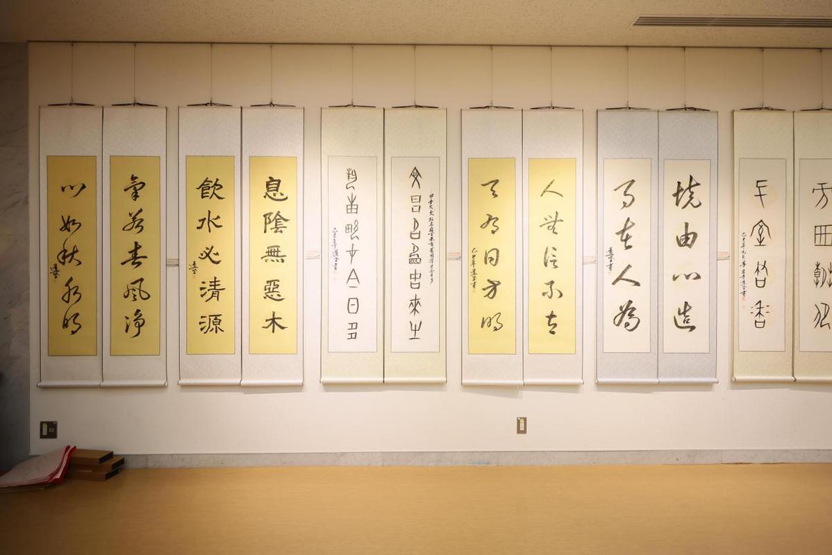 展览共展出中国重庆华岩寺方丈道坚法师精心创作的60余幅书法作品,涵盖甲骨文、楷书、行书等多种书体。内容以中国传统文化经典语句、中国古诗词为核心,同时特别创作了象征中日友好的词句,如「山川异域 风月同天」「一衣带水 共话千秋」等。作品笔力遒劲、意境深远,既传递了中华传统文化的深邃智慧,亦寄托了对中日世代友好的殷切期许。