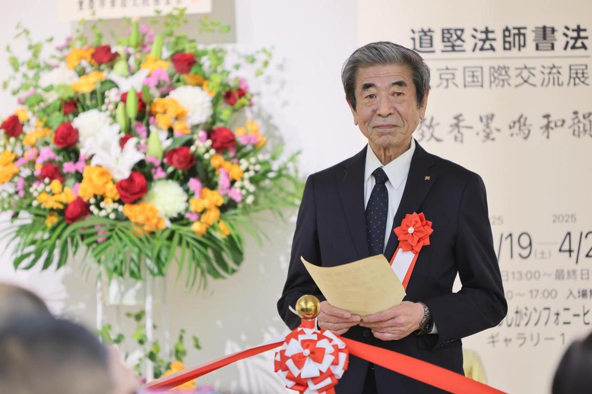 日本嘉宾永田哲二代表日方致辞,高度评价道坚法师作品融禅意于笔墨,化经典为桥梁,并期待两国以文化交流为基石,深化民间友好。