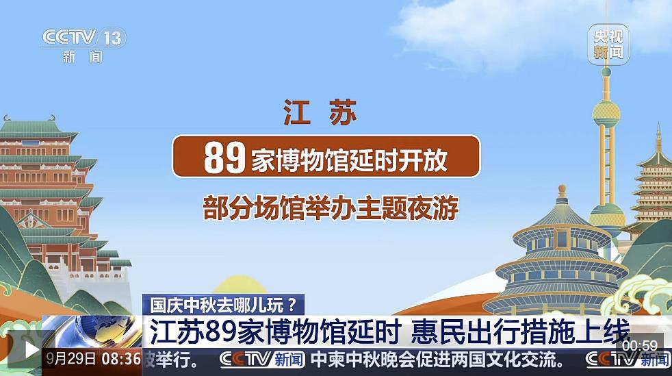 国庆中秋假期,江苏全省有89家博物馆延时开放,部分文博场馆举办主题夜游活动。将有21场大型营业性演出,预计观众人数近60万人次。在线旅游平台预订数据显示,各平台江苏旅游产品预订量分别较去年假期有15%以上的增长。