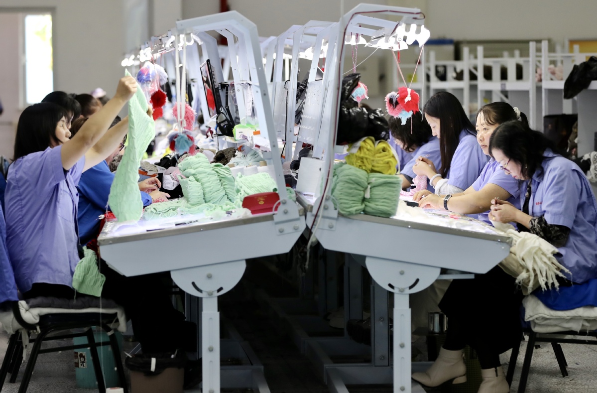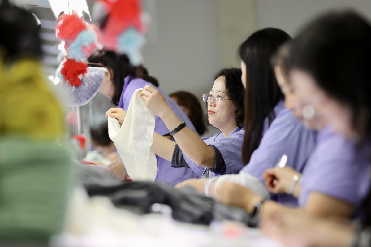 10月11日,鄂尔多斯针织二厂生产车间,工人在检验产品。中国日报记者 张威 摄