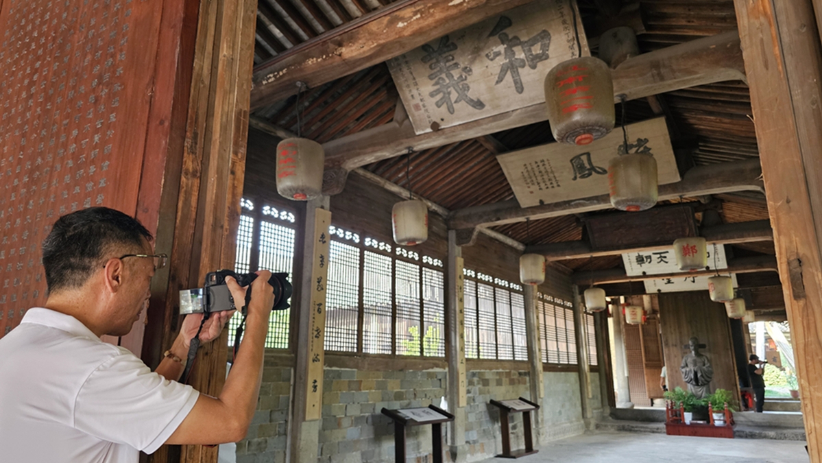 10月13日,一名游客在郑义门古建筑群拍摄牌匾。中国日报记者 耿菲菲 摄