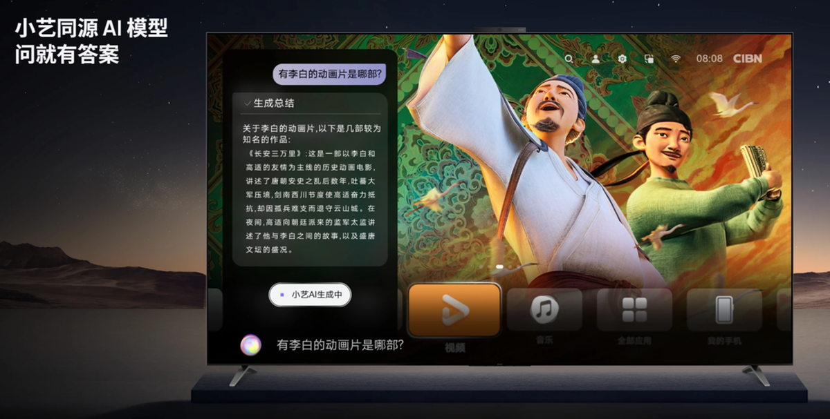 AI 搜片功能基于原有大模型基础下对搜片场景做了专属的应用优化,结合智慧屏本身的资源范围,智能提取问答结果,精准推荐片源和播放链接,配合语音控制,一键直达精彩片段。