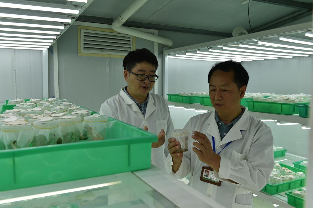 图为宋光龙及其工匠室成员查看蠋蝽繁育情况