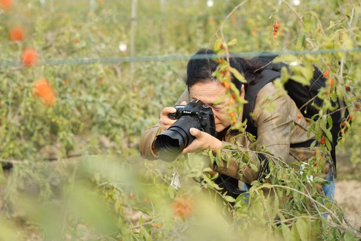 在百瑞源殷红子熟枸杞庄园,秋日的阳光倾洒在这片1500亩的土地上,让每一颗枸杞都闪烁着诱人的光泽,仿佛是大自然精心镶嵌的红宝石。在专业摄影师的引导下,银龄摄影爱好者迅速进入创作状态。有的专注于捕捉枸杞饱满的果实与翠绿枝叶相互映衬的画面,以特写镜头展现丰收的细节。