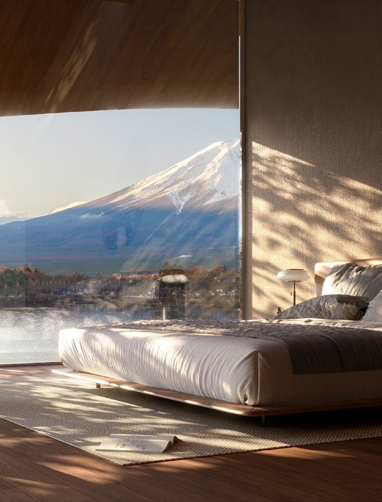 此次合作的核心载体——日本山中湖【雁柏】酒店项目,坐拥世界级自然与景观资源。作为富士五湖之首,山中湖海拔980米,如蓝宝石般镶嵌在富士山东麓,不仅是五湖中面积最大的湖泊,更因 “钻石富士” 奇观成为全球游客向往的目的地。每年秋冬时节,落日与富士山顶精准重合,1-2分钟的金光冠雪胜景倒映湖面,被誉为 “吉祥天象”,而山中湖作为富士山东麓唯一湖泊,正是观赏这一奇观的绝佳之地。