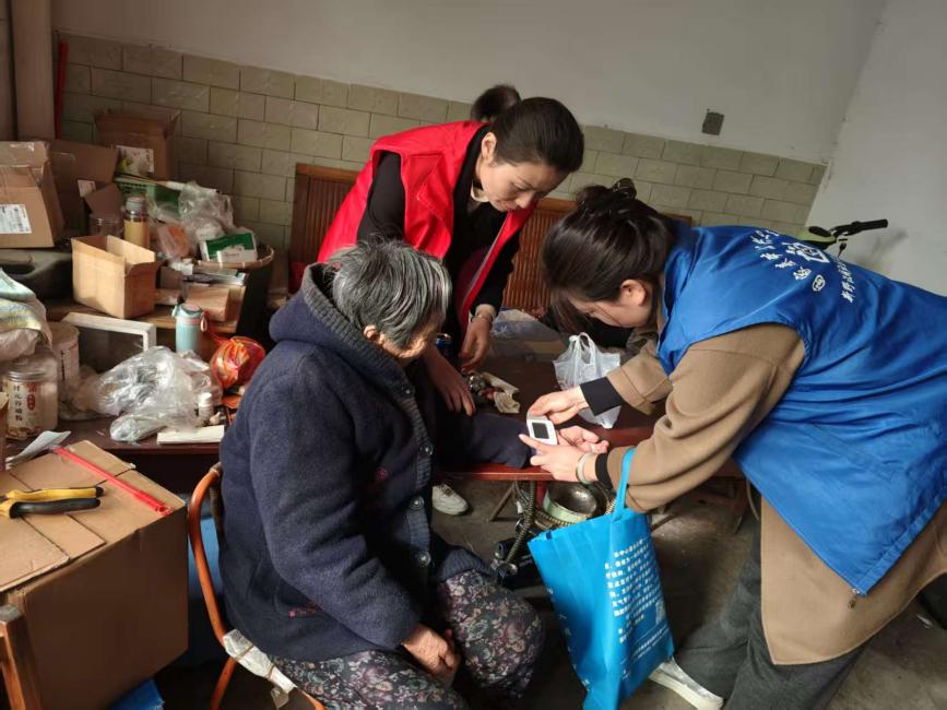 图为汉城街道白水社区的志愿者和签约“家庭医生”上门为行动不便老人测血糖