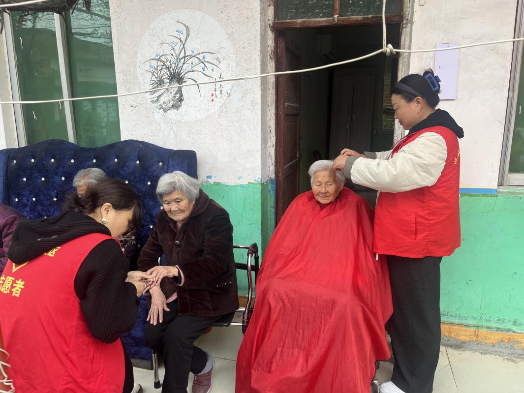 图为东关社区的志愿者为辖区养老院老人理发剪指甲