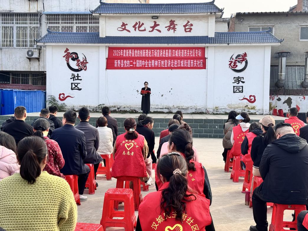 图为新野县百姓宣讲员郭紫薇正在为汉城街道社区干部和居民宣讲党的二十届四中全会精神