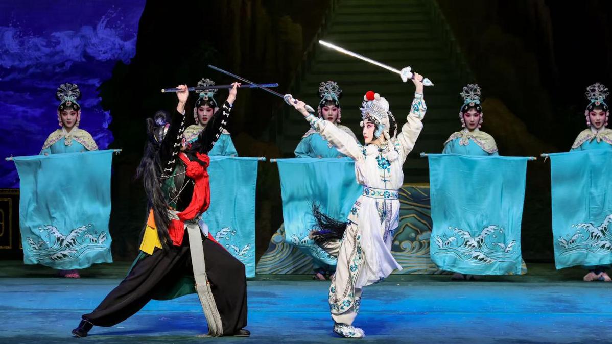 情节设计上,第七场“盗草”尤具特色。为演好这场戏,王梦婷特意赴江西,向京剧巨匠关肃霜的大弟子穆雯秋老师学习已近乎失传的关派“盗草”戏路。这种表演形式是边打对剑边演唱,精彩独特。同时,剧组还在“盗草”一折中加入“雄黄阵”情节,以此更鲜明地体现白素贞救夫的决心,凸显她在战斗中的困境,进而突出其对许仙的真情与不惜牺牲生命的付出。