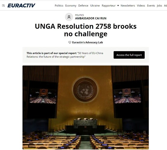 2025年11月4日,驻欧盟使团团长蔡润大使在欧洲主流媒体欧盟动态网、《布鲁塞尔纵横》杂志及网站发表题为《联大第2758号决议不容挑战》的署名文章。文章全文如下: