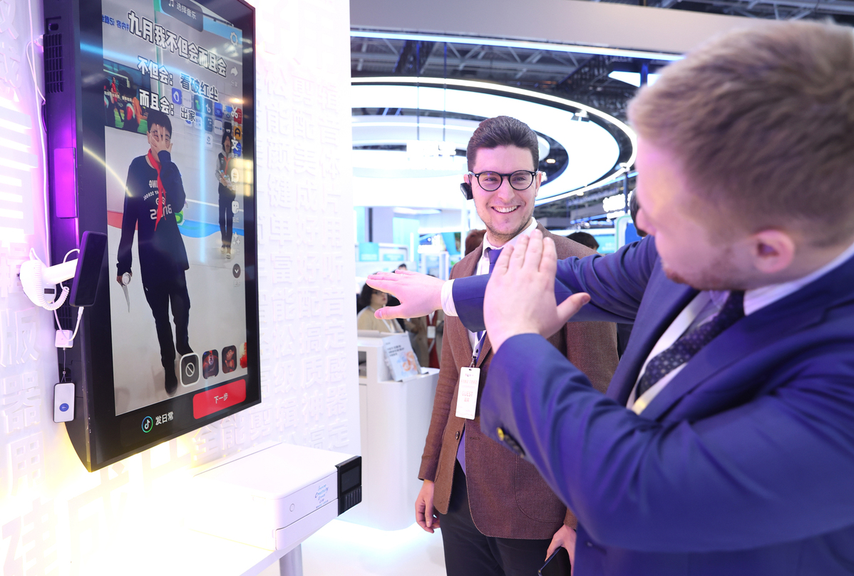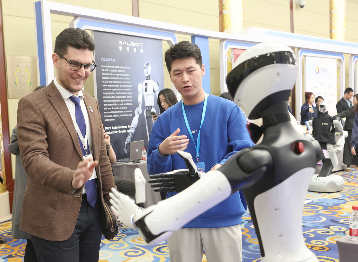 11月11日,嘉宾在北京友谊宾馆与机器人互动。中国日报记者 邹红 摄