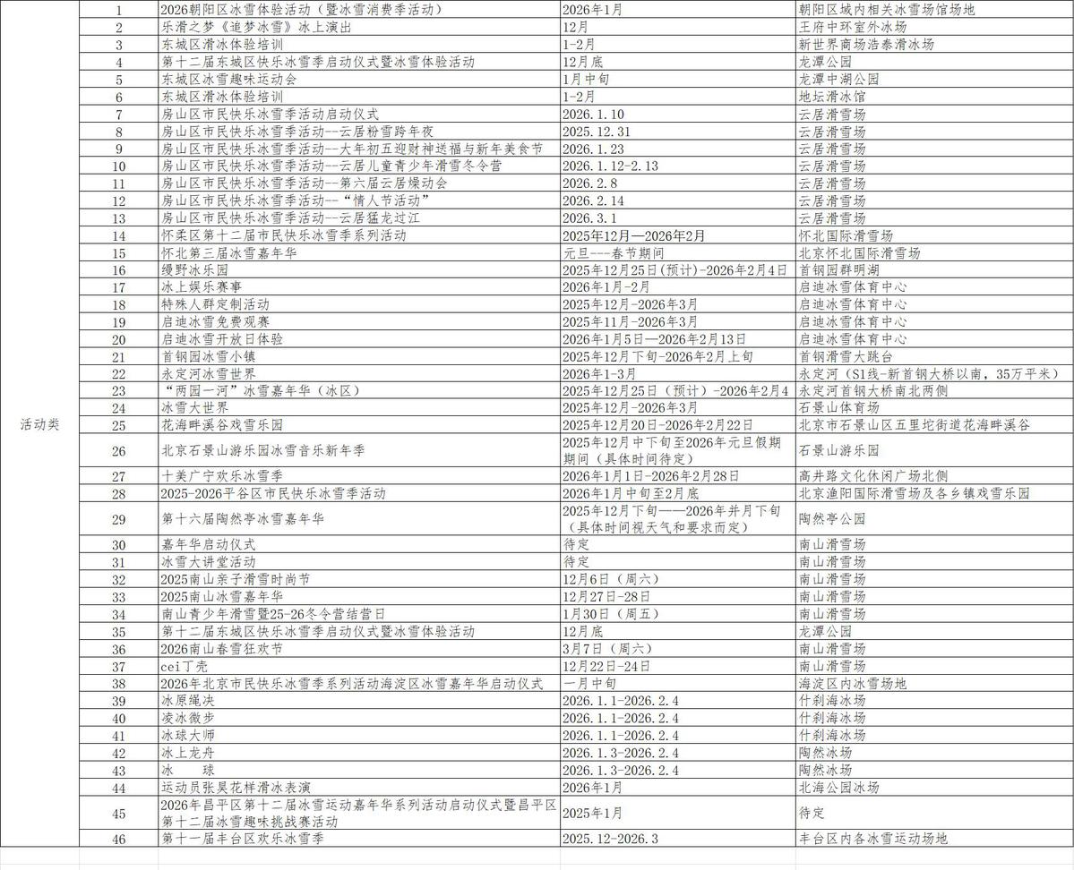 涵盖60余场北京市及各区举办的赛事、演出、体验、特色活动等。