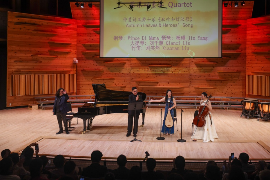 下半场的器乐四重奏《秋叶和好汉歌》由普林斯顿大学艺术中心常驻音乐总监和作曲家、钢琴家文森·迪·穆拉,与琵琶演奏家杨瑾、竹笛演奏家刘笑然、大提琴家刘千慈联袂呈现,该作品将爵士经典《秋叶》与中国民歌《好汉歌》并列呈现。