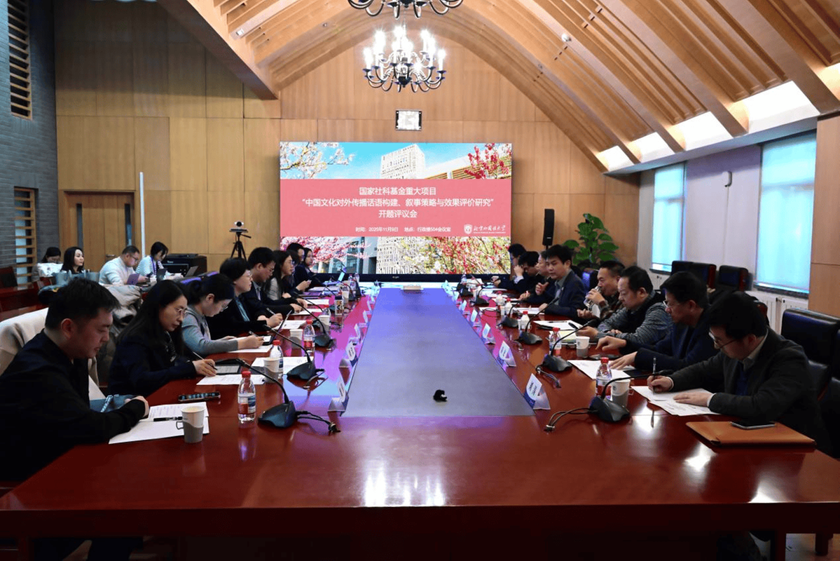 当日下午还举行了国家社会科学基金重大项目“中国文化对外传播话语构建、叙事策略与效果评价研究”(项目编号:24&ZD214)开题评议会。项目由北京外国语大学邓秀军教授担任首席专家。北京外国语大学党委常委、副校长赵刚教授出席会议并担任评议组专家,北京外国语大学校学术委员会主任袁军教授担任评议组组长。专家们对项目价值、实施方案和研究进展给予高度认可。