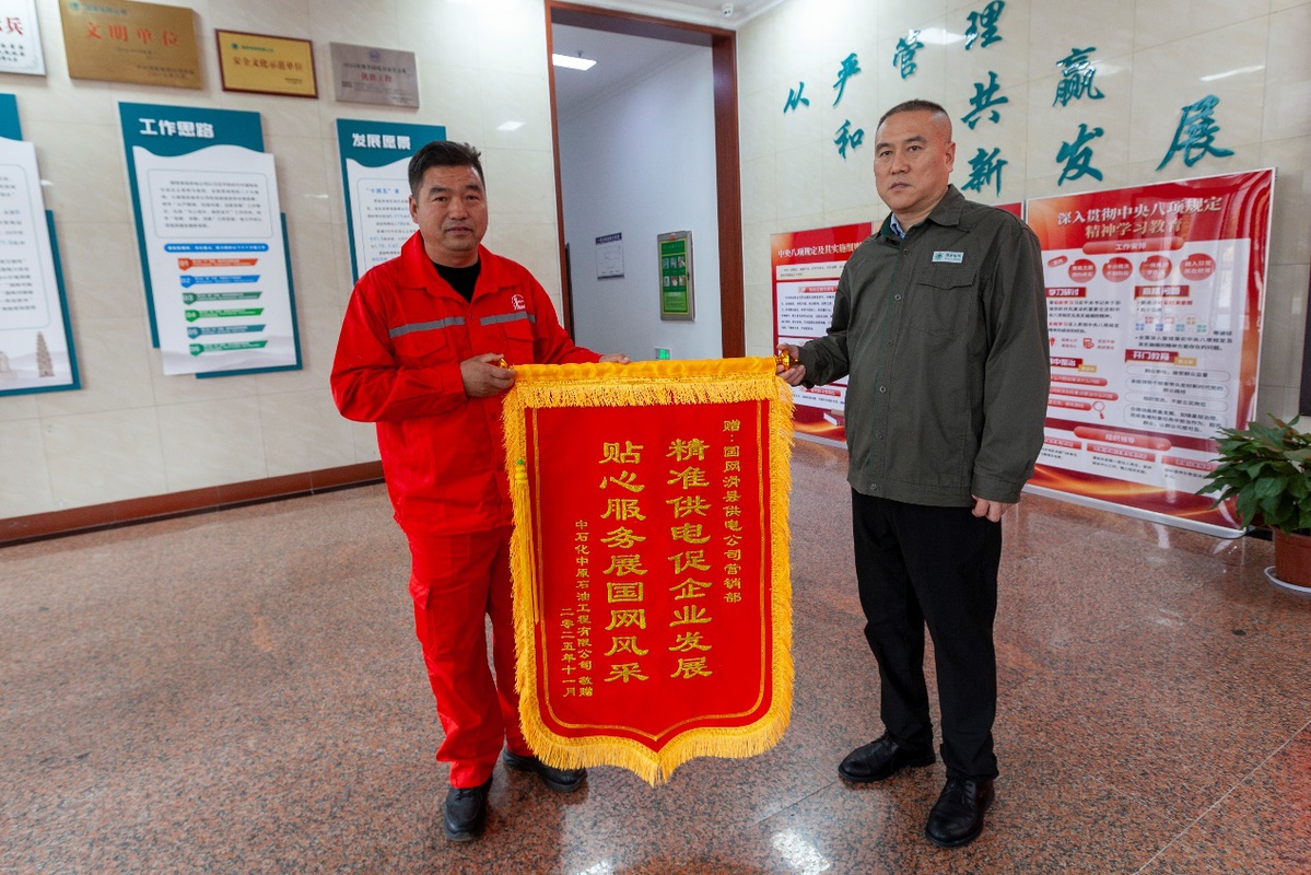 11月10日上午,中石化中原石油工程有限公司钻井一分公司物资装备保障中心副科长郑志峰专程来到国网滑县供电公司,将一面印有“贴心服务展国网风采,精准供电促企业发展”的锦旗送到国网滑县供电公司副总经理张振勇手中,对供电公司高效完成3150千伏安变压器报装接电服务表达诚挚谢意。