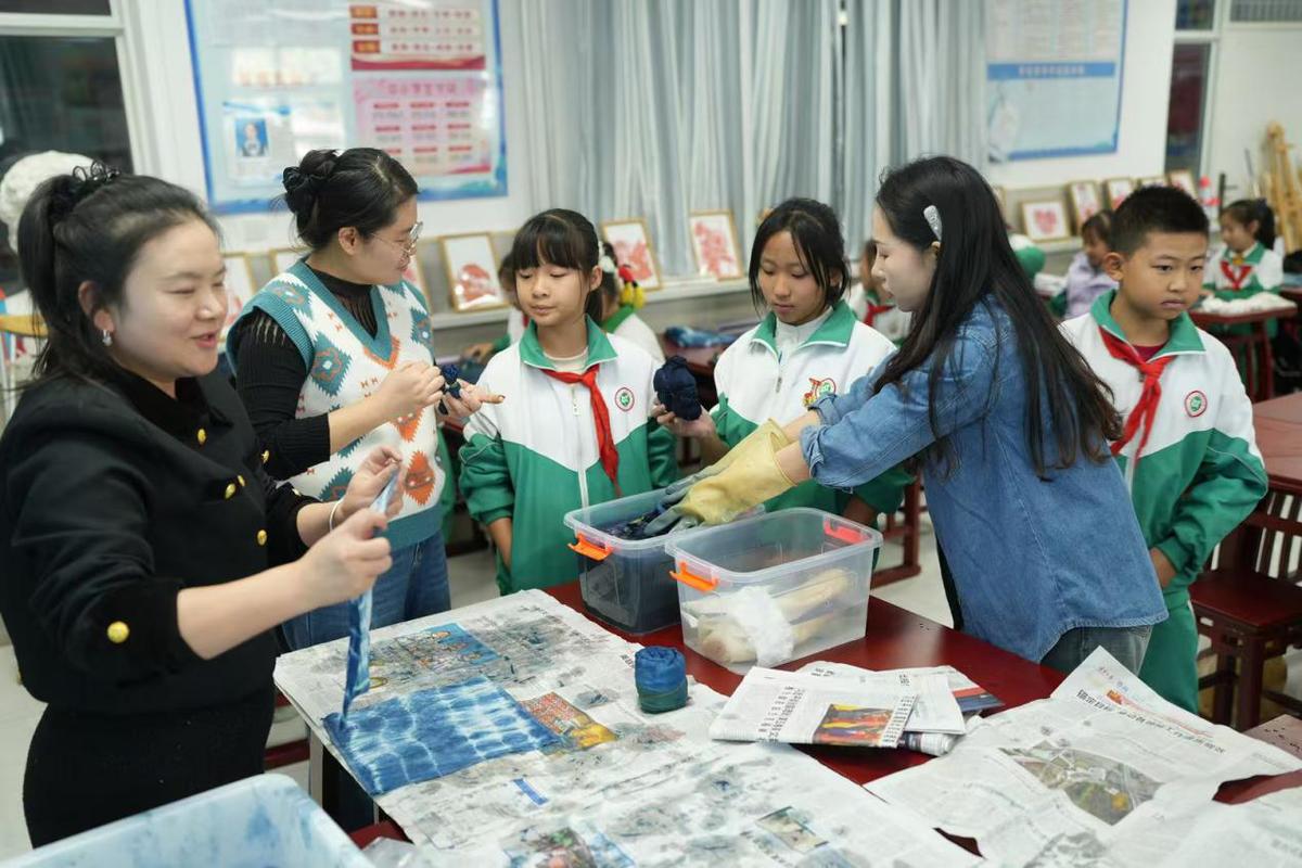 “非遗扎染” 体验中,王老师为每位学生发放了白色小方巾,现场传授了三种经典扎染图案的制作方法。在老师的耐心指导下,学生们兴致勃勃地学习捆扎技巧,小心翼翼地将方巾按照自己的想法捆扎成型,随后使用天然蓝靛泥植物染料进行染色。当学生们将染色后的方巾清洗干净,见证布料在空气中逐渐氧化变色的神奇过程时,现场欢呼声不断,大家都为这一奇妙的非遗工艺惊叹不已,纷纷展示着自己独一无二的扎染作品。