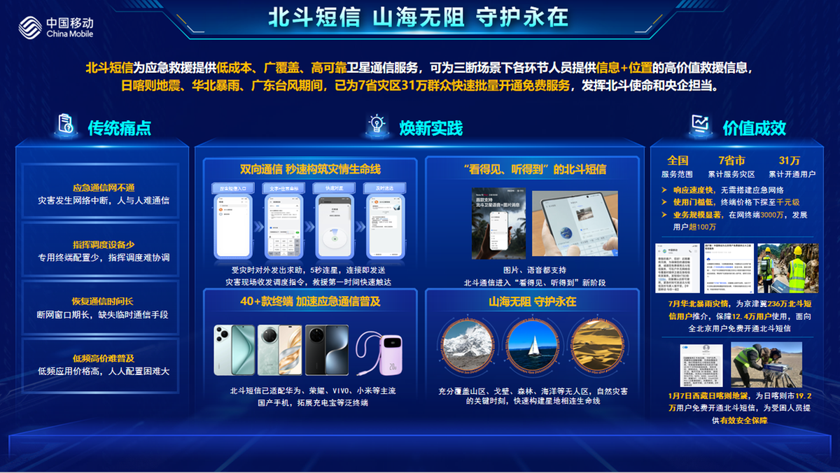 空天地一体应急通信体系,破解应急通信瓶颈。今年7月,北京密云、怀柔特大山洪期间,中型垂起固定翼无人机高空基站在“三断区域”飞行12架次,为6000人次提供紧急通话。在2025年日喀则地震中,日喀则市的19.2万用户免费开通了北斗短信应急服务,在没有信号覆盖的情况下通过短报文功能进行通讯。近日北斗短信迎来重大升级,上线了图片、语音的发送功能。