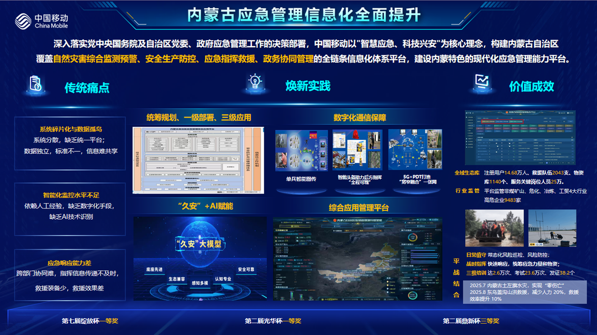 11月18日至20日,以“新质赋能 智慧应急”为主题的2025年中国国际应急管理展览会在北京国家会议中心举办。本次展会中国移动以“碳硅共生,合创AI+应急新时代”为主题,涵盖“AI+应急通信、AI+监测预警、AI+应急指挥、AI+智慧消防、AI+安全生产、AI+城市安全”六大核心领域,全面呈现智能化、数字化技术在应急领域的深度应用。