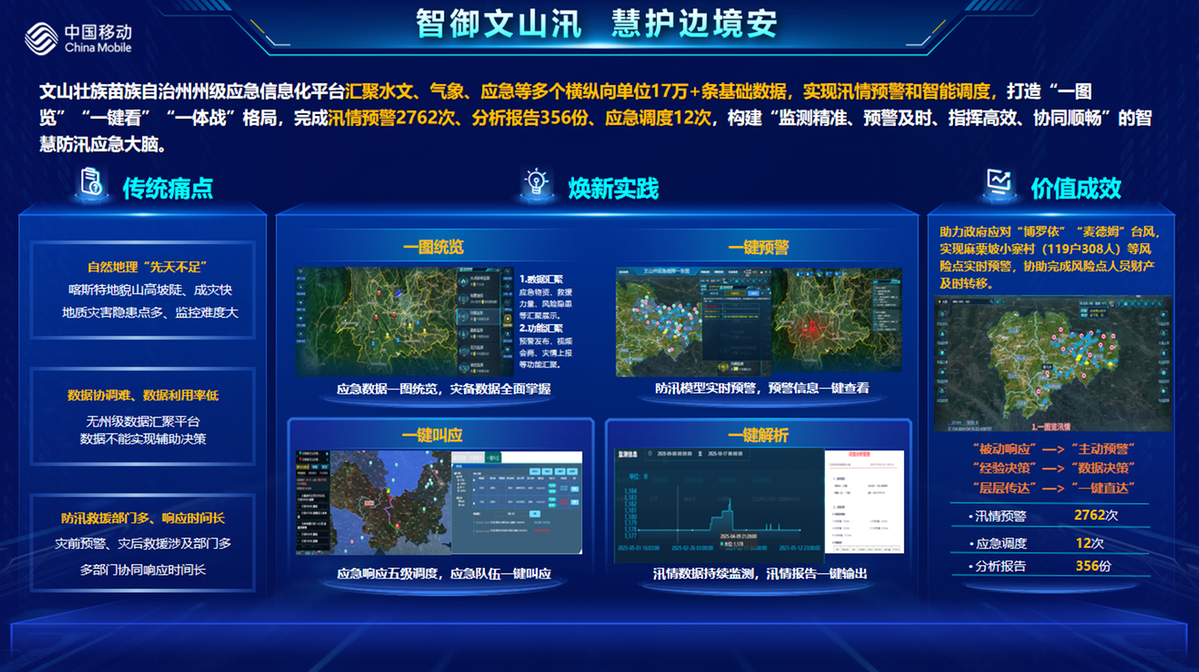 AI赋能综合感知,自然灾害动态预警。云南是自然灾害高发、易发省份。云南应急视频管理系统通过接入70.5万路视频资源,上线117项AI智能分析算法,构建了全省“一盘棋”的视频感知网络。在文山壮族苗族自治州,州级应急信息化平台构建汛情告警数据模型,完成红、橙、黄、蓝风险一键预警。自9月试运行以来,平台累计完成汛情预警2762次、应急调度12次,输出汛情分析报告356份。