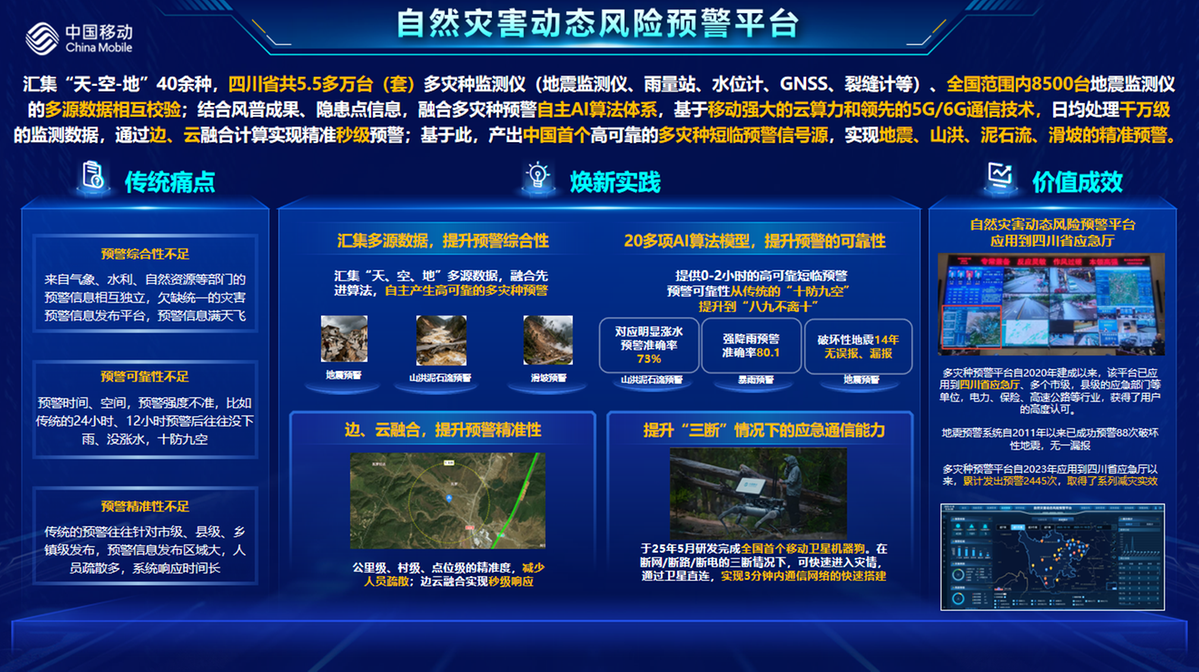 在四川,自然灾害多样频发。自然灾害动态风险预警平台将地震台网数据、气象数据、水利水电等多源数据不断迭代,形成高可靠的灾情垂直模型,将点位预警范围精准到公里级,并可提供0-2小时的高可靠短临预警。