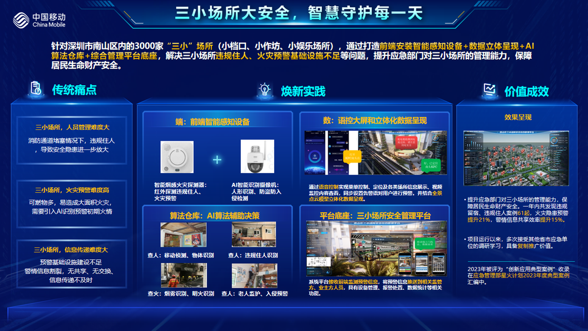 安全生产无小事,城市安全韧性高。在深圳市南山区有近3万家“三小”场所(“小档口”“小作坊”“小娱乐场所”),智慧安全监管系统通过已安装的智能烟感设备和AI摄像机,建立物联设备信息共享系统,全面督促业主整改消防隐患。在北京市房山区基础设施灾后重建中,中国移动通过“平台+网络+智能终端”模式,集成AI安全隐患识别、AI振动波形检测等功能,实现了对800余个项目、4000多名人员的精准监管,显著增强了城市抗风险与精细化管理能力。
