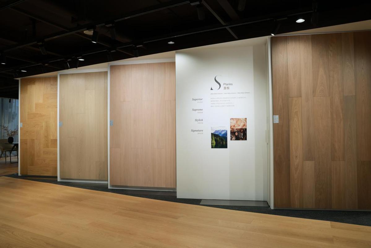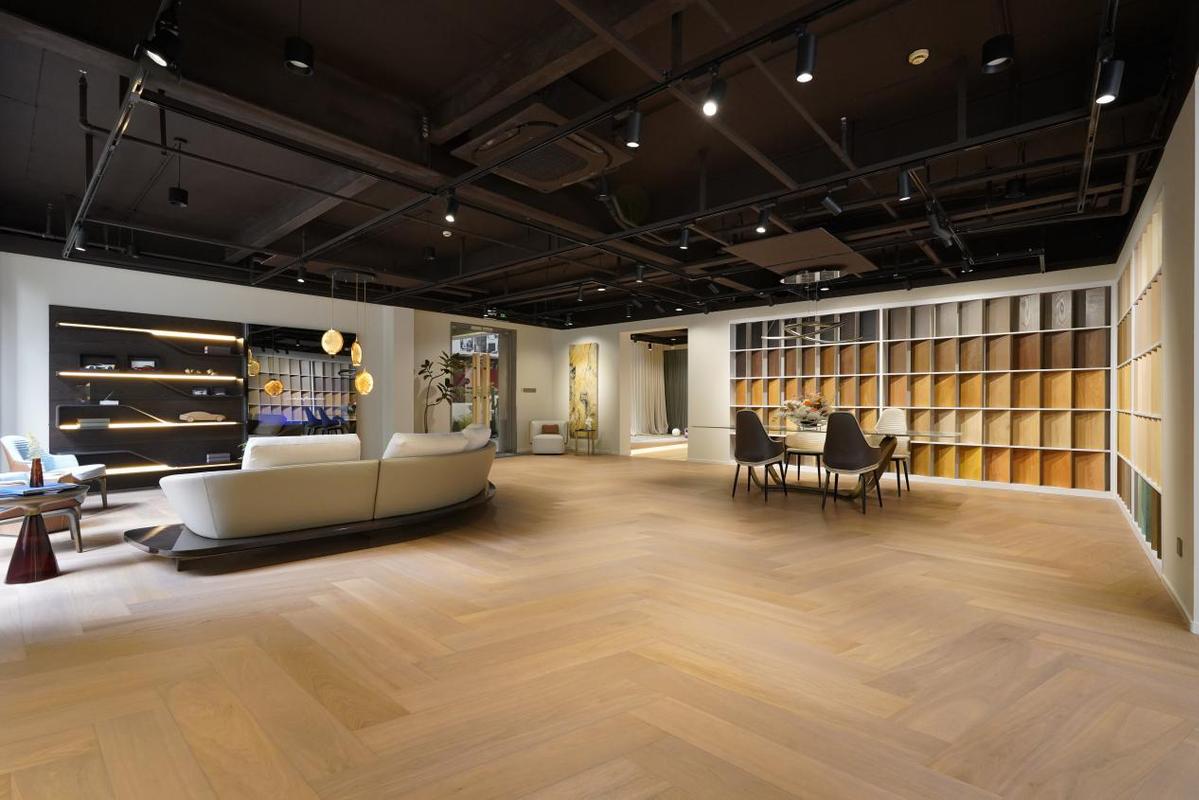 拾级而上,旗舰店二层如多元地板世界的探索实验室,在此,不同参数、不同工艺地板的肌理与特性均可触摸、体验,并在专业导购的辅助下完成科学选材与个性化定制。