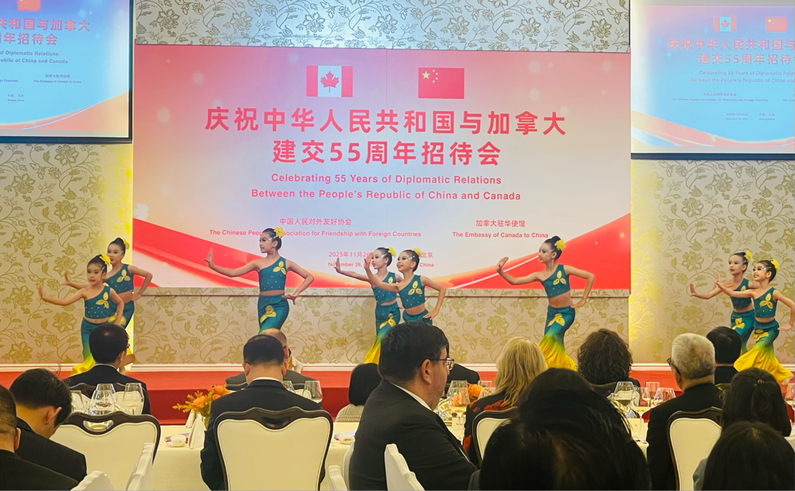 中国日报北京11月27日电(记者 张陨璧)11月26日,中国人民对外友好协会与加拿大驻华使馆在京共同举办庆祝中国与加拿大建交55周年招待会。中国人民对外友好协会会长杨万明、外交部部长助理蔡伟、中国人民对外友好协会副会长沈昕、加拿大驻华大使梅倩琳以及中加两国各界代表百余人出席活动。杨万明会长和梅倩琳大使分别致辞。