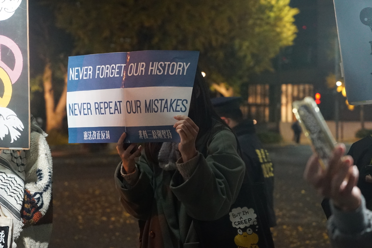 中国日报11月29日电(记者 侯俊杰)11月21日、25日和28日,多名民众在位于东京的首相官邸前举行集会,抗议日本首相高市早苗在国会发表的涉台错误言论,要求其撤回相关表态并作出解释和道歉。抗议者们举着写有“撤回言论 反对战争”“因高市才有事”“高市下台”等标语的牌子,高喊“反对战争、守护和平”等口号,多名抗议者要求高市对其涉台言论负责并辞去首相职务。