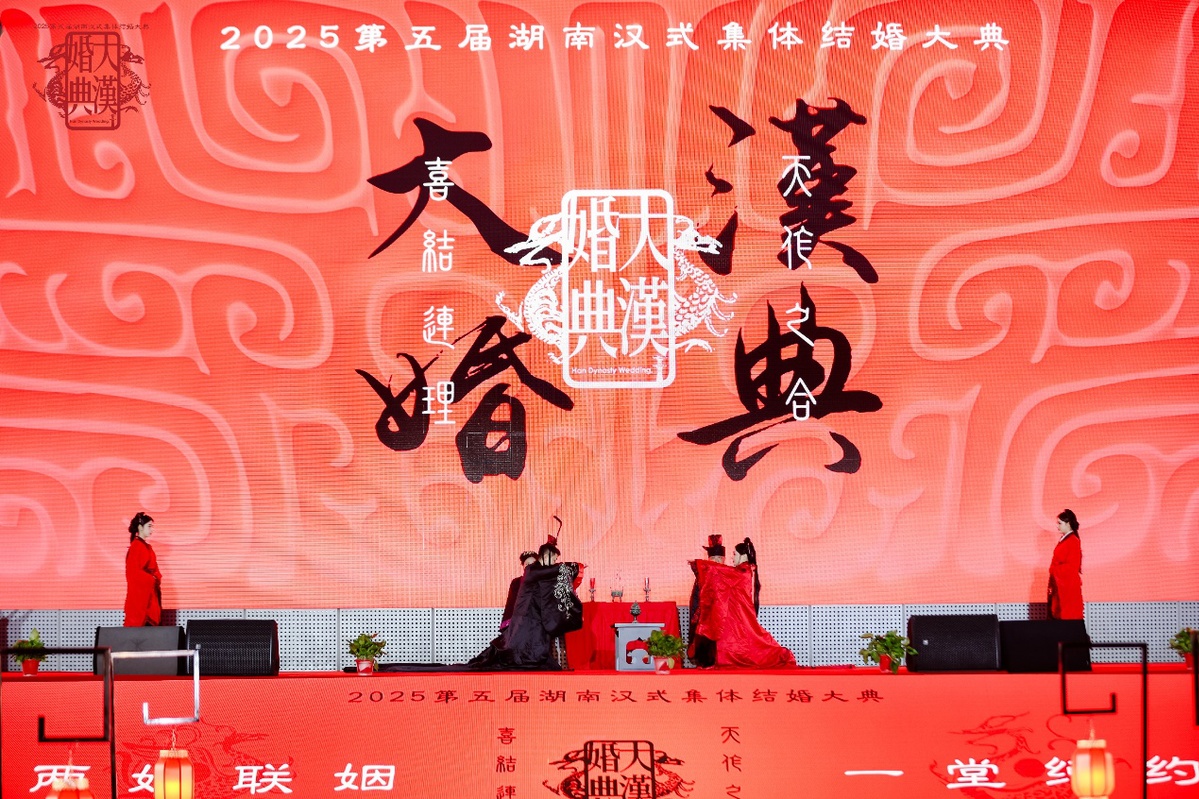 中国日报11月29日长沙讯 11月29日晚,2025第五届湖南汉式集体结婚大典(以下简称“大汉婚典”)在长沙市天心区黄兴南路步行商业街举行。黄兴广场被红绸、灯笼和汉式图腾装点得古意盎然,37对新人齐聚于此,用千年古礼许下了相守一生的承诺。