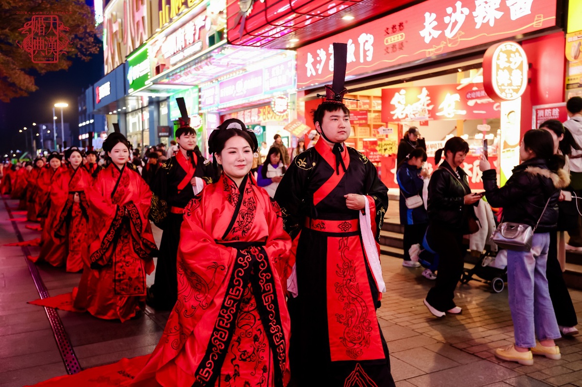 新郎们头戴汉制长冠,身着玄色(青黑)上装和纁色(浅红)下裳,神情郑重、步伐整齐地从黄兴广场出发到南门口迎接新娘们。新娘们一袭交领红裙,珠钗摇曳,步履翩然。双方汇合后,巡游队伍经司门口返回黄兴广场,沿途市民驻足拍照,自发追随,宛若穿越古今的礼乐画卷。