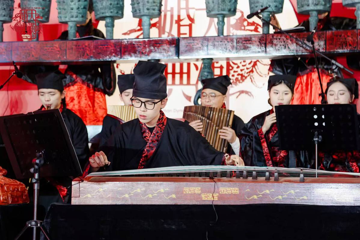 礼仪进行间隙,大铙乐舞《太平盛典》为这场盛典增添了视听上的震撼。用于现场演奏的钟鼓大乐重现三千年前楚汉时期的青铜编钟、编铙、编磬等古乐器,其恢弘的乐声穿越了三千年时光,为婚典注入了厚重的历史底蕴。
