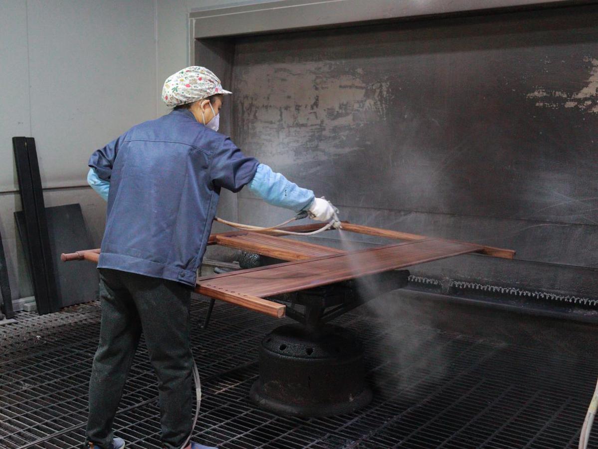 (南康家具企业车间内,工人正在喷涂水性漆作业)