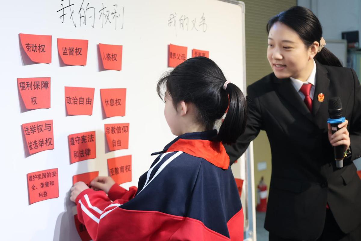 “同学们,宪法是国家的根本大法,它规定了我们的基本权利和义务,就像一棵大树的树根,是所有法律的基础……”活动现场,青年法官张婉斌用通俗易懂的语言,结合生动案例,向同学们讲解了宪法的地位、作用以及与日常生活息息相关的条款。讲解过程中,法官不时抛出问题,“我们都有受教育的权利,这写在宪法的哪一条呀?”“爸爸妈妈抚养我们,是他们的权利还是义务呢?”同学们聚精会神,争相回答,在互动问答中加深了对宪法知识的理解。