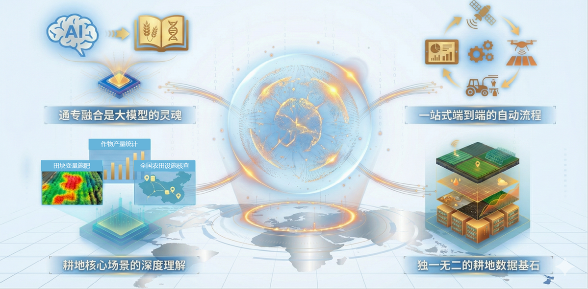 该模型的核心创新在于首创了"通识大模型+领域知识+垂直工具链"的协同智能体架构。团队以先进基础大模型为"总调度脑",深度灌注了海量、多源的耕地时空数据与专业规则,并集成融合了数十个针对田块分割、设施识别、作物分类、长势反演、工程质检等细分场景的专用"垂直模型",形成了既能理解复杂指令、又能精准调度专业工具执行的"智能体集群"。