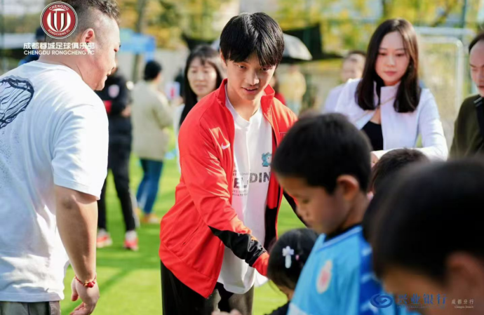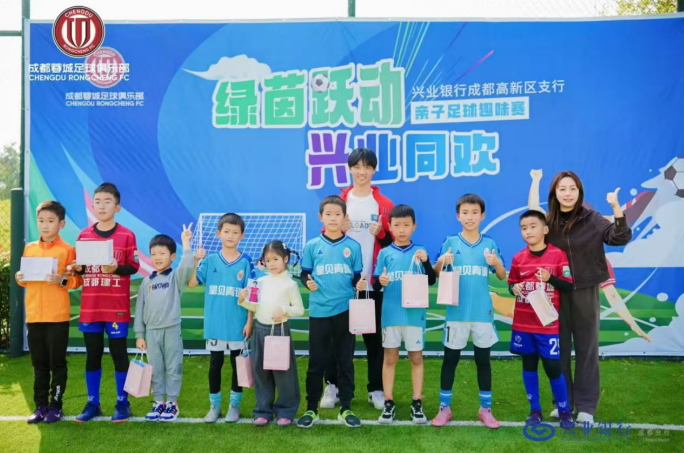 赛后,一场别开生面的兴业银行成都分行x成都蓉城俱乐部“员工运动会”在凤凰山体育场举行。成都蓉城主力中场大将杨明洋换上印有“兴业银行”袖标的蓝色亲子T恤,与小朋友们展开趣味PK——“带球穿越障碍赛”“定点射门保龄球”“1V1亲子接力”。杨明洋现场为小朋友示范带球动作和足球规则,吸引大家极大的运动热情与兴趣。