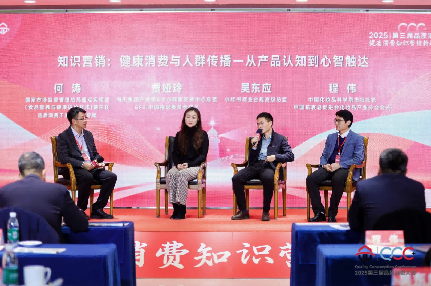 在圆桌对话环节,围绕"知识营销:健康消费与人群传播——从产品认知到心智触达"这一主题,《网络食品营养健康知识营销良好行为规范》标准牵头起草专家、国家市场监督管理总局重点实验室(食品营养与健康评价技术)副主任何涛担任主持,与淘天集团产业带&中小商家支持中心总监、GFSI中国指导委员会成员贾娅玲,小红书商业合规高级总监吴东应,中国化妆品科学杂志社社长、中国抗衰老促进会化妆品产业分会会长程伟等嘉宾展开了深入交流。