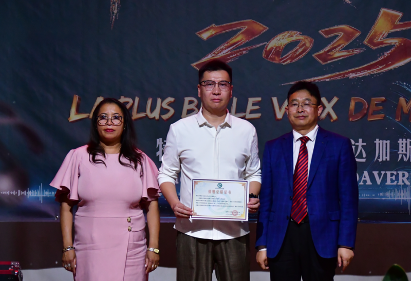 点评结束后,现场嘉宾依次为获奖选手颁发荣誉证书与奖品。魏祖钦院长和玉兰院长还特别向本次大赛赞助方及冠名单位——探索马达加斯加集团董事长刘凡先生颁发捐赠荣誉证书,对企业助力中非文化交流的担当与情怀表达诚挚谢意。