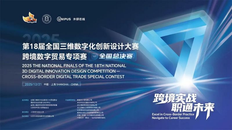 12月21日,2025第18届全国三维数字化创新设计大赛跨境数字贸易专项赛全国总决赛于上海对外经贸大学顺利举办。本次大赛由全国三维数字化创新设计大赛组委会、国家制造业信息化培训中心、全国三维数字化技术与教育培训联盟、北京光华设计发展基金会主办,上海对外经贸大学承办,北京外研在线数字科技有限公司(简称“外研在线”)已连续两年全程协办,支持大赛从省赛到国赛顺利落地实施。