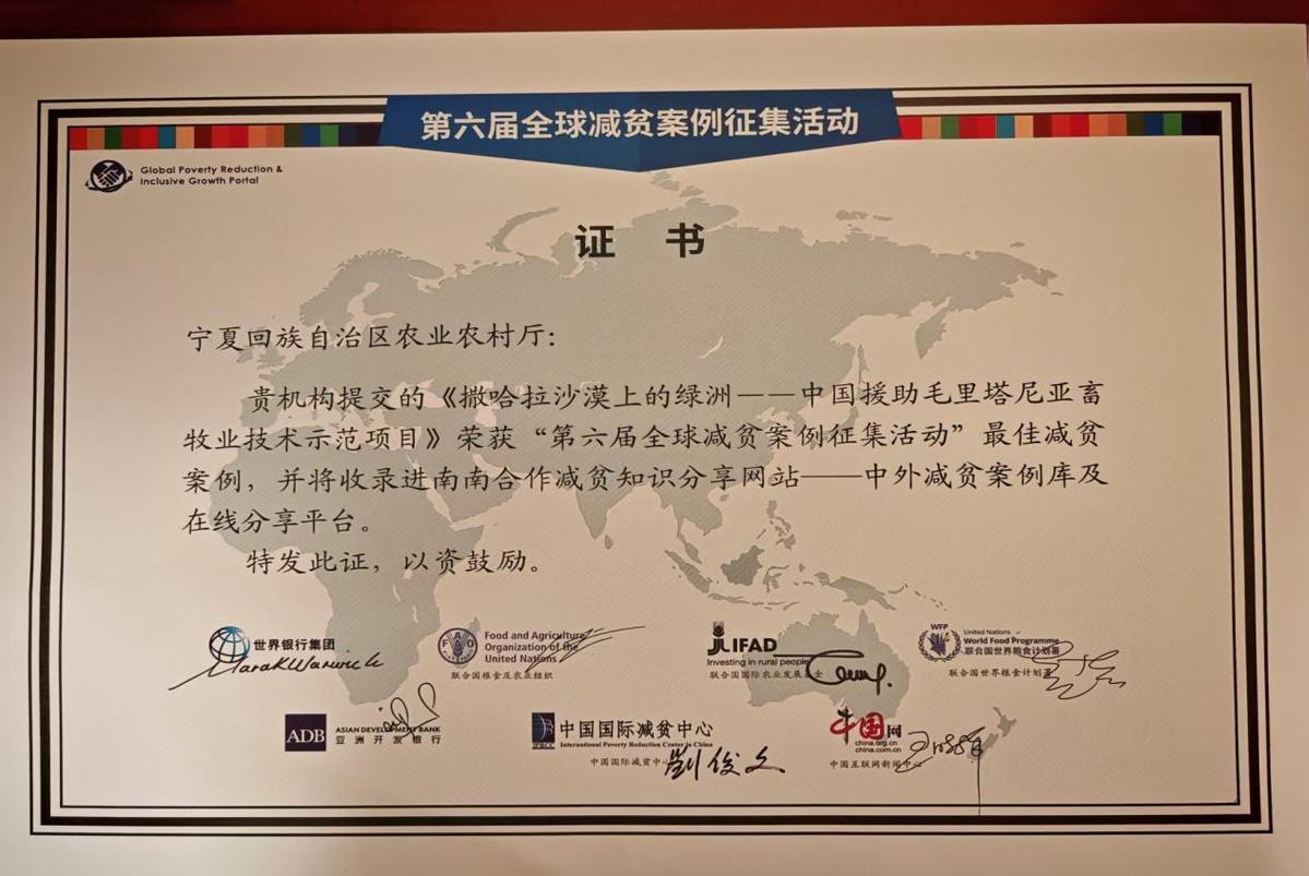 宁夏农业农村厅选送的《撒哈拉沙漠上的绿洲——中国援助毛里塔尼亚畜牧业技术示范项目》获“第六届全球减贫案例征集活动”最佳减贫案例。这是继2024年《巧媳妇数字乡村助力弱势群体发展——闽宁禾美电商帮扶车间案例》获奖后,宁夏再次获此项国际殊荣。