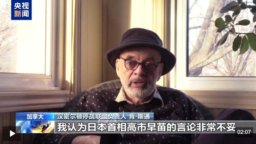 汉密尔顿停战联盟负责人 肯·斯通:我认为日本首相高市早苗的言论非常不妥,极具战争色彩,非常危险。鉴于日本在二战期间,对美国、中国、菲律宾和东南亚人民犯下的战争罪行,绝不允许日本再次以武力威胁任何邻国。他们为日本制定了一部宪法,其中第九条规定,日本永远放弃发动战争,高市早苗正在做的是试图让日本成为亚太地区的军事大国。他们必须记住,日本人、美国人、加拿大人必须记住,早在20世纪70年代,我们就签署文件,承认了一个中国原则。日本首相应该受到加拿大、美国以及所有在二战期间打败日本军国主义的国家的谴责。