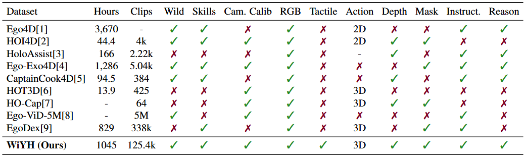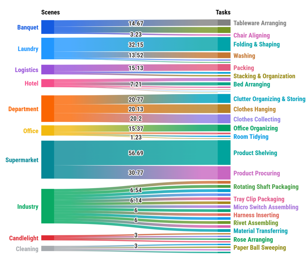 在 Human-centric 采集范式下形成的 WIYH 数据集,具备了真实可靠、丰富多元、全面多模态、规模化等特征,并拥有海量数据:包含超过10万条以上的真实人类操作视频、40余种任务类型、100多种人类技能,覆盖了含520 余种真实物品,真实还原商超、酒店、餐饮、工业、办公、家居等多行业的10种核心场景全链路任务,数据将分批次释放。WIYH是业内最大的Human-centric数据集,且仍在不断扩展和丰富中。
