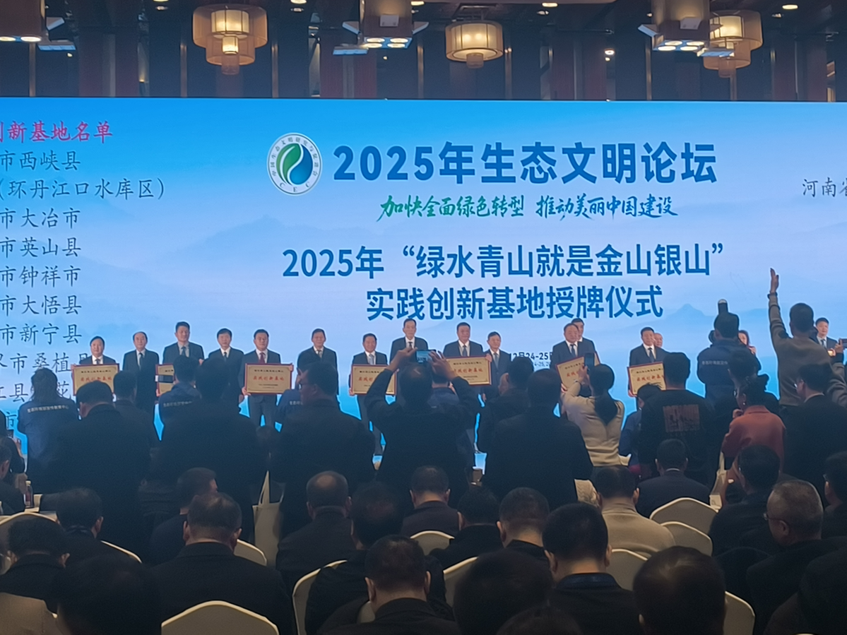 12月25日,在中国生态文明促进会主办的2025生态文明论坛上,西峡县与北京市朝阳区崔各庄乡等91个地区被生态环境部命名为2025年“绿水青山就是金山银山”实践创新基地,这是继西峡县2020年创成国家生态文明建设示范县后又获得的一项生态文明建设领域殊荣。