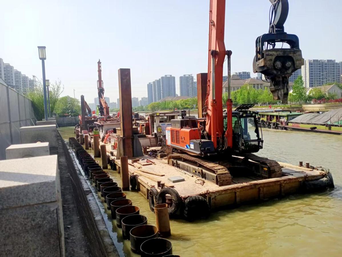 由于工程地处苏州古城核心区域,紧邻寒山寺景区,周边历史底蕴深厚、人文景观密集,生态环境敏感。项目团队秉持“最小干预、最大保护”的绿色施工理念,守护古城生态“颜值”。工程建设区域涵盖国家级生态管控区——枫桥景区,团队结合景区环境特点量身定制专项绿色施工方案。严格落实施工扬尘防治“6个100%”要求,通过每日巡河与无人机常态化管控,构建全天候环境监测网络。优化施工时序与工艺,严格控制作业时间,最大限度降低噪声、振动对周边景区及居民区的影响。推行建筑垃圾分类回收与资源化利用,与地方政府协同推进土方就地调配,减少渣土外运,实现资源节约与环境保护的双赢。此外,项目通过护岸生态化改造、沿岸绿化补植等举措,让升级后的航道与古城风貌、自然景观无缝相融,尽显“清水绿岸、城水相依”的生态画卷。