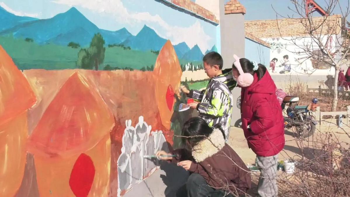 孩子们踮起脚尖勾勒线条,志愿者俯身细致填色,大家默契配合,按照精心设计的图案逐帧创作。笔触流转间,“千里江山图”的瑰伟秀丽在墙面铺展,稻浪翻滚、瓜果飘香的五谷丰登图景栩栩如生。