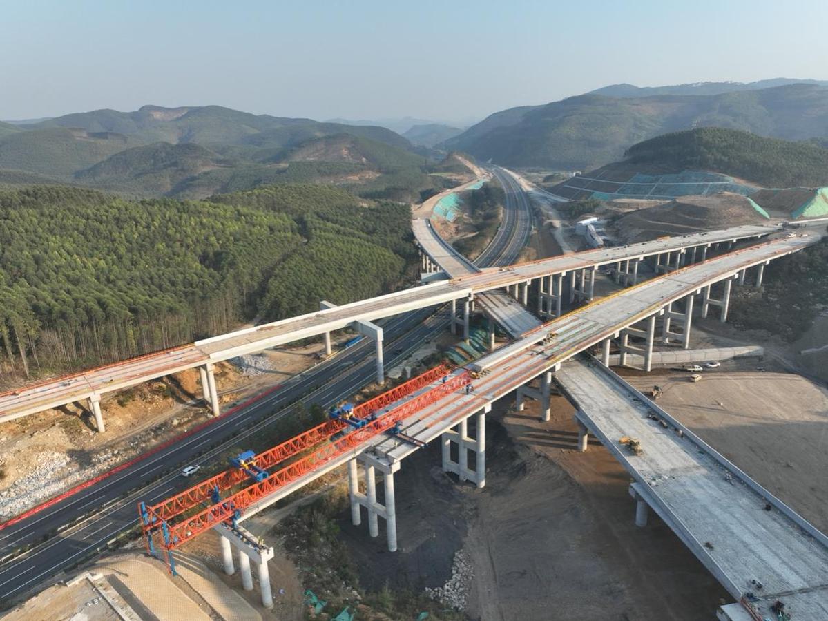 针对地形受限、跨线施工、梁体尺寸等难点,项目建设团队筑牢安全质量防线,采用一台起重量240t,跨度40m,起升高度7.5m架桥机和两台130吨汽车吊组合方式有序开展梁板架设作业,实现全线大小14座桥梁743片梁板“零缺陷”预制,无事故架设;在太阳枢纽施工现场,钢箱梁架设需上跨运营中的梧柳高速,项目协同交警路政等单位多次现场勘查与模拟,优化跨梧柳高速钢箱梁吊装方案,采用单机抬吊+高频监测定位工艺,通过高频监测定位实时校准梁体姿态,落梁精度达±5毫米,提前二十天完成32节段钢箱梁架设节点目标,有效减少了交通拥堵与施工干扰,节约施工成本。下一步项目建设团队将继续统筹资源配置、严控节点工期,全力推进桥梁架设、路面摊铺及后续机电交安等工程,预计2027年6月建成通车。