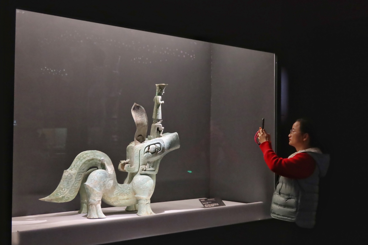 1月18日,观众参观展出的青铜神兽。中国日报记者 姜东 摄
