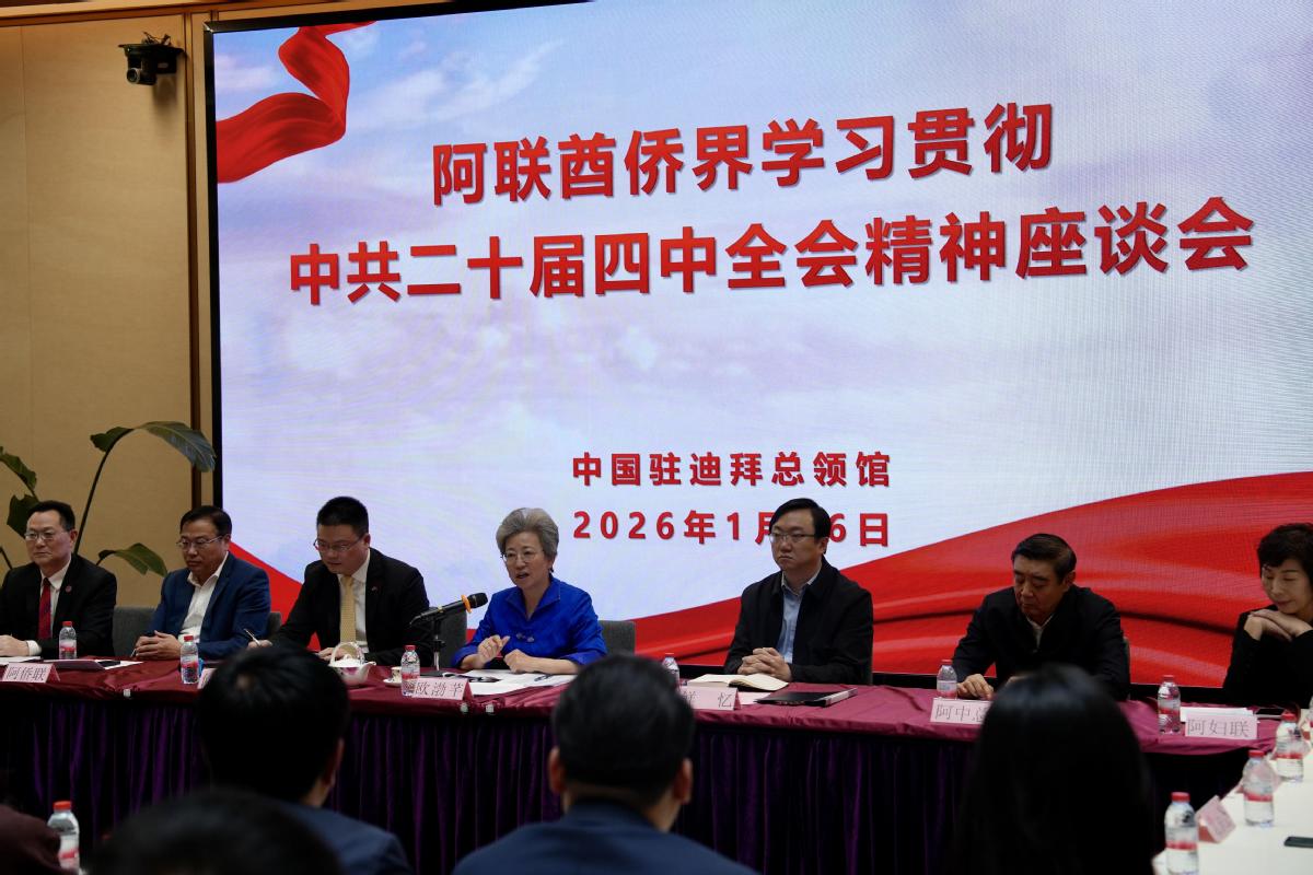 总领馆同日举办了阿联酋侨界学习贯彻中共二十届四中全会精神座谈会。欧渤芊听取了与会代表的学习心得分享,肯定旅阿侨界的学习成效,重点宣介全会精神及“十五五”规划建议的核心要义。她勉励广大旅阿侨胞坚定信心、抢抓机遇、接续奋斗、创新发展,主动当好中阿交流的桥梁纽带,服务国家发展战略和中阿合作大局;同时要求各侨团加强团结协作与规范化建设,推动侨社实现高质量发展。