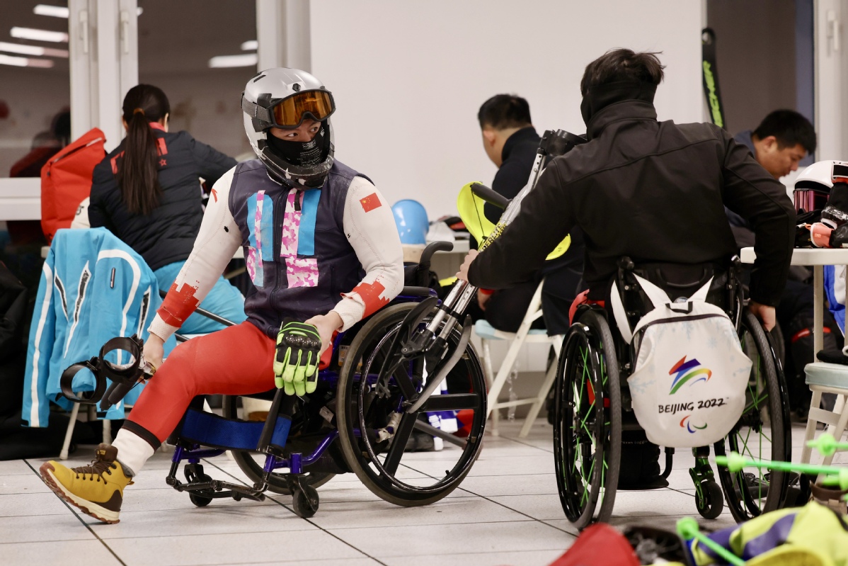国家残奥高山滑雪队的队员们在训练前整理装备。中国日报记者 魏晓昊 摄