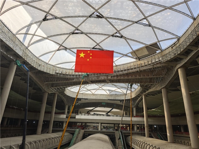 主站房及东接驳场站精装修工程,枢纽的特殊性决定了装修装饰材料的种类繁多、工艺复杂,定制材料数不胜数,施工难度前所未有。是中铁一局项目管理团队采用“BIM+装配式”施工技术,实现12.5万平米的石材、铝板、GRG板等装修装饰材料工厂预制、现场拼装,精度误差控制在±1mm以内,宛如为城市打造了一件精美的艺术品。项目管理团队积极应对,将施工区域按照配合单位、施工内容、现阶段场地实际情况等多个要素进行网格化划分,在夹缝中一块块、一片片完成合同内施工内容,展现了卓越的管理能力和团队协作精神。为了打造“阳光车站”,将阳光引入地下32米的站台,从地面至B3层站台无任何建筑物和附着物,在距站台32米的穹顶处需要安装GRG板,作业垂直高度巨大。项目管理团队通过分析现场情况,研究国内同类项目施工经验,组织专题会研究施工方案,引进高空作业蜘蛛车这一新型施工设备和其他施工工法,最终在保证“零伤亡、零事故”的前提下,保质保量完成高大空间GRG板安装。